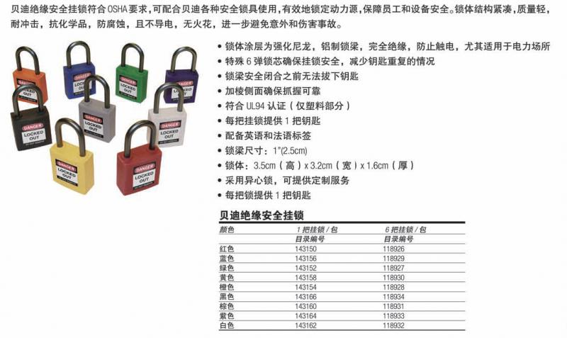 特性和優(yōu)點(diǎn):1• 外形緊湊,質(zhì)量輕 2 • 一體式“無縫”鎖體結(jié)構(gòu)經(jīng)久耐用• 玻璃纖維強(qiáng)化尼龍鎖體,防撞性能更佳 3• 三重涂層硬質(zhì)鋼鎖梁具有出色的防腐蝕性能 4• 特殊6彈鎖心確保掛鎖安全,進(jìn)一步減少鑰匙重復(fù)的情況 5• 安全功能可避免在鎖梁安全閉合之前拔下鑰匙。 6• 即使佩戴手套,加棱側(cè)面仍可確保抓握可靠 7• 可提供8種醒目顏色 8• 單獨(dú)出 售,提供6個(gè)裝套裝 9• 每把掛鎖提供1把鑰匙